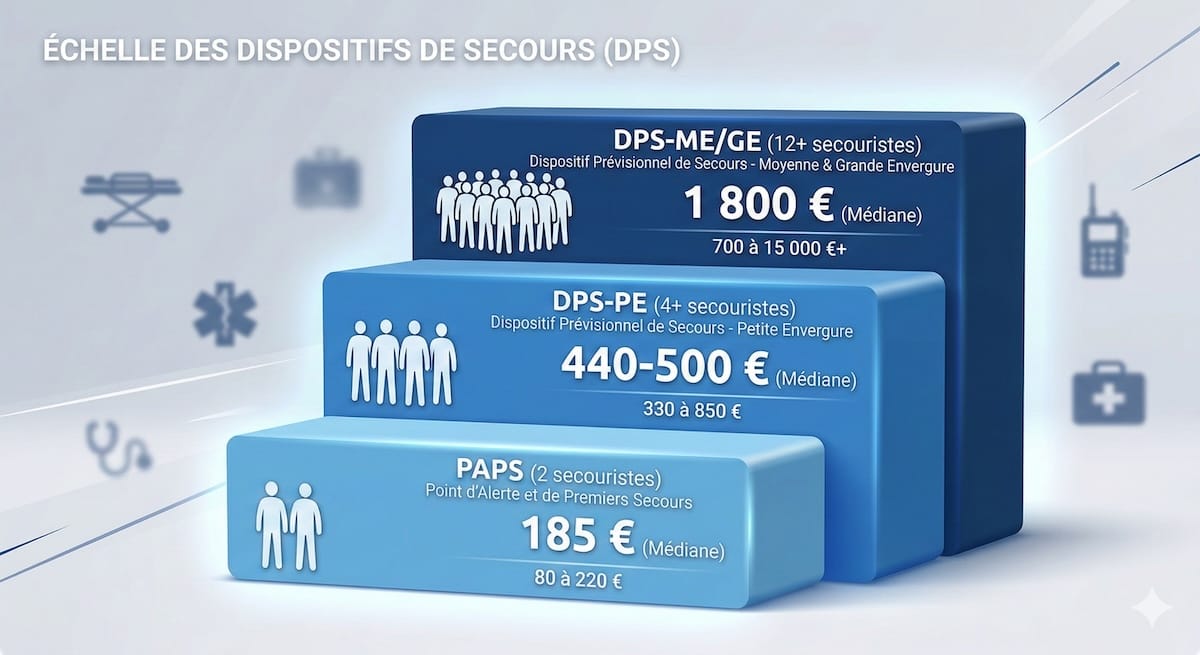 Point d’alerte et de premiers secours (PAPS — 2 secouristes) : les tarifs se situent entre 80 et 220 €, avec une médiane autour de 185 €.